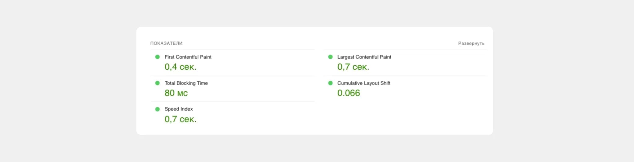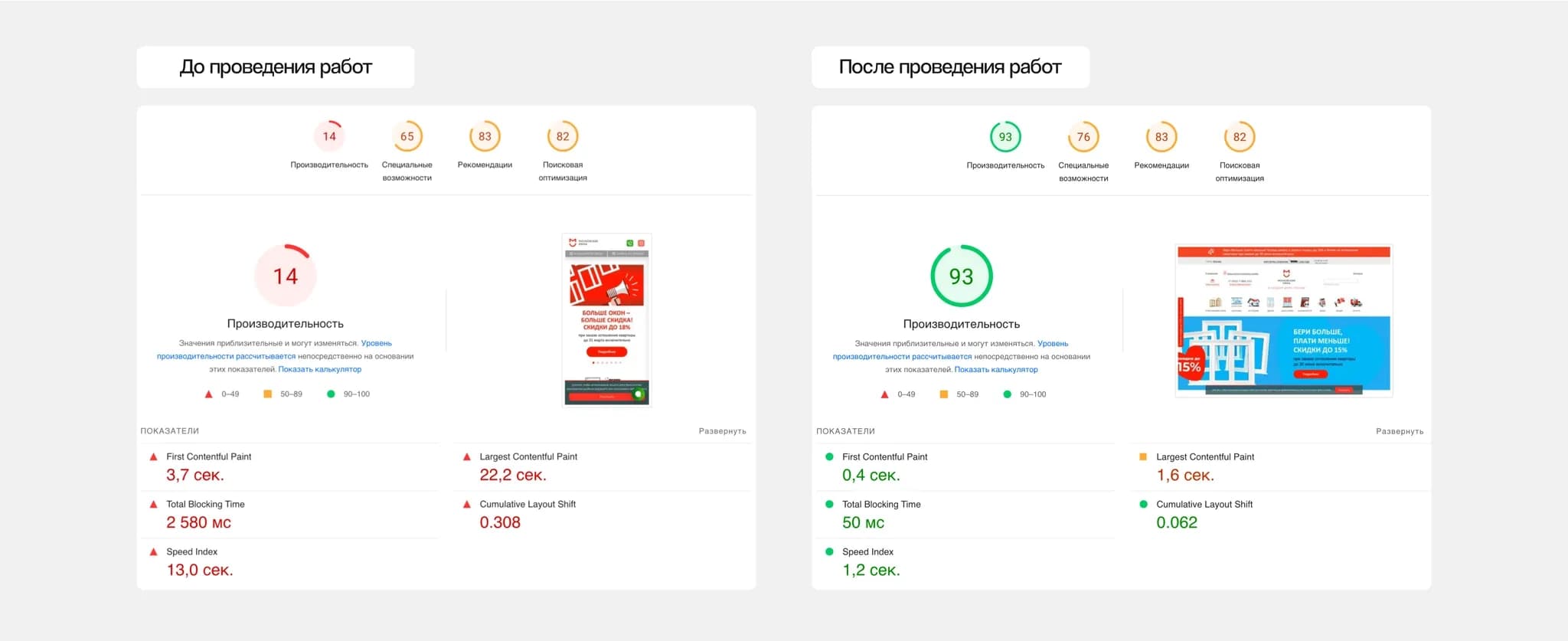 Команда разработчиков настроила отложенную загрузку JS-скриптов, «почистила» коды, конвертировала и сжала контент. По итогам работ удалось сократить значения для FCP и LCP до 0,4 и 0,7 секунд. CLS снизился до рекордных 0,006-0,009.