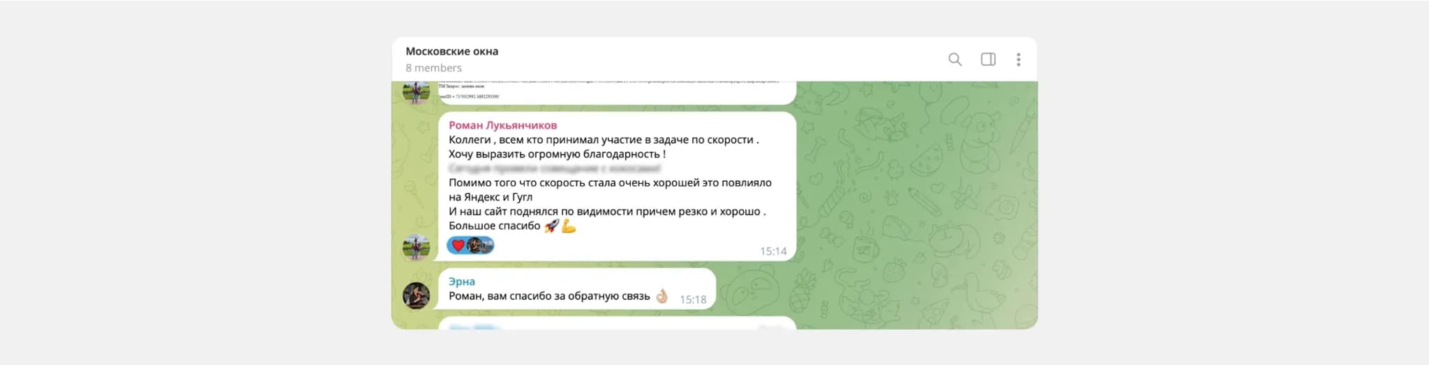 Клиент хотел напрямую общаться с разработчиками, особенно во время масштабных работ. Требование клиента реализовалось в создании рабочего чата в Telegram.