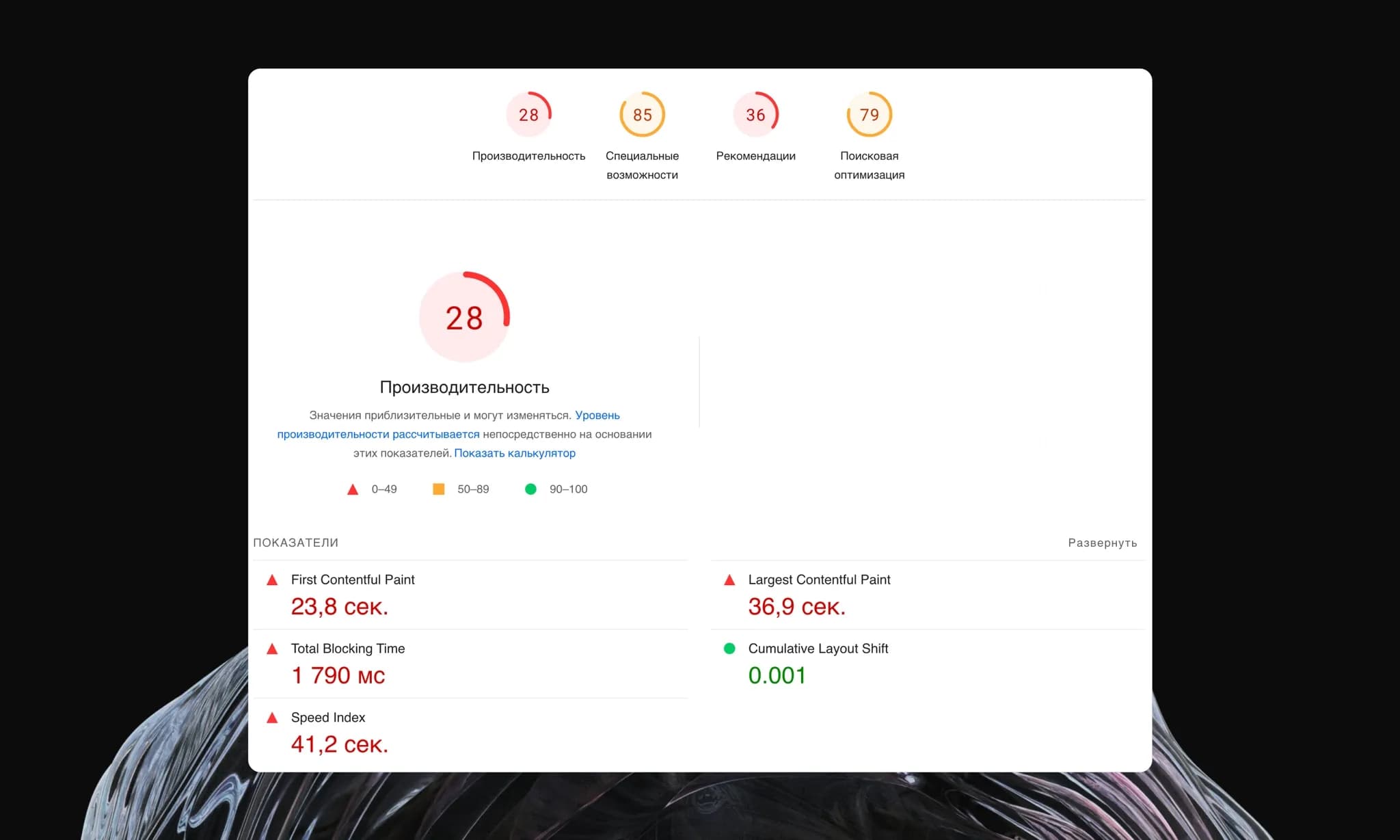 - Speed Index — свыше 40 секунд.