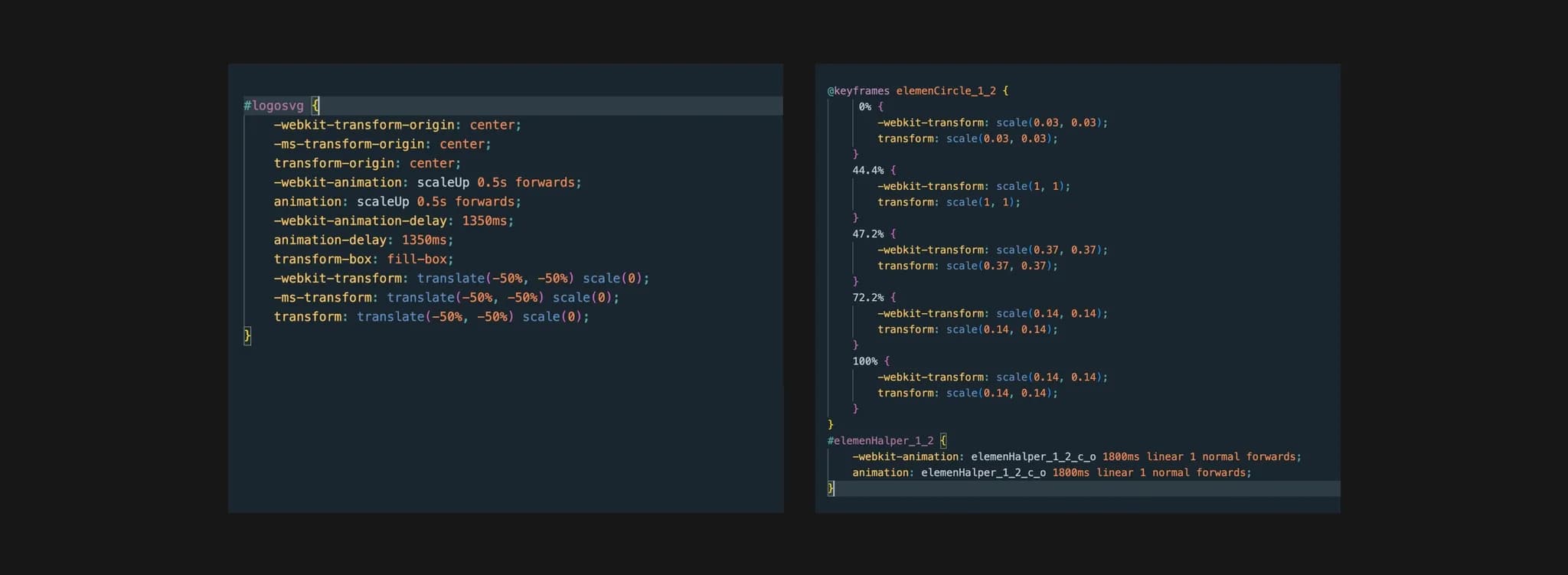 Анимация включает в себя не только перемещение элементов в пространстве, но и изменение их формы. Так для каждого элемента нам пришлось отдельно рассчитывать ключевые кадры, тайминги и задержки. Также добавили вендорные префиксы для одинаковой работы анимации в разных браузерах. Спустя более тысячи строк CSS-кода и двух дней работы мы могли похвастаться анимацией, которая выполняется на любом утюге любом устройстве и браузере.