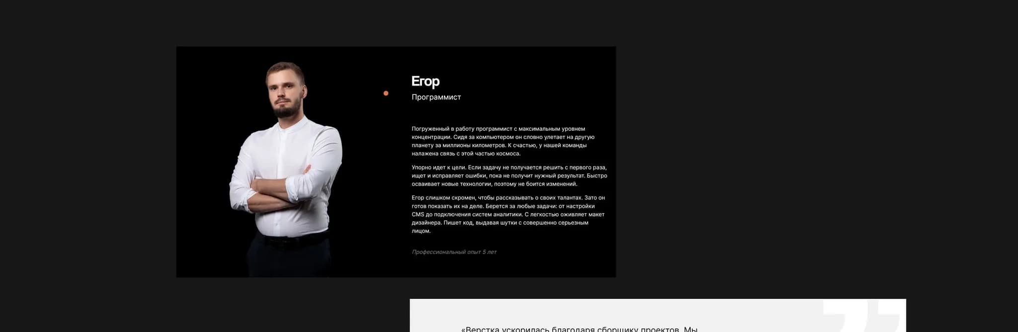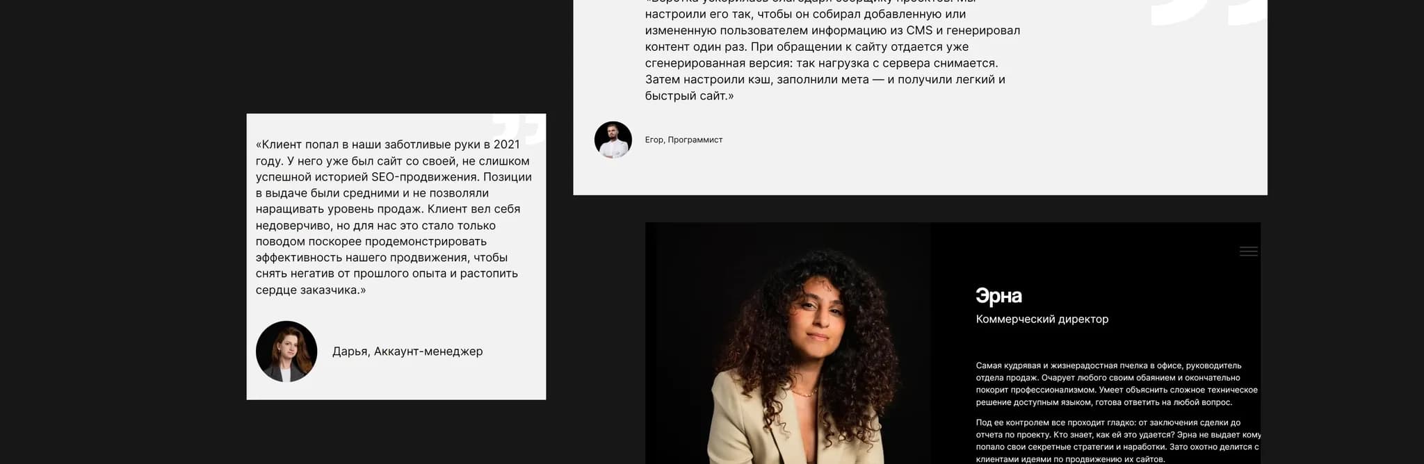 Все данные о сотрудниках собраны в одном массиве: имена, фото, описания, профессиональный опыт. Данные выводятся там, где это нужно — например, в кейсах. Авторы цитат всегда отображаются с корректной должностью и фотографией.