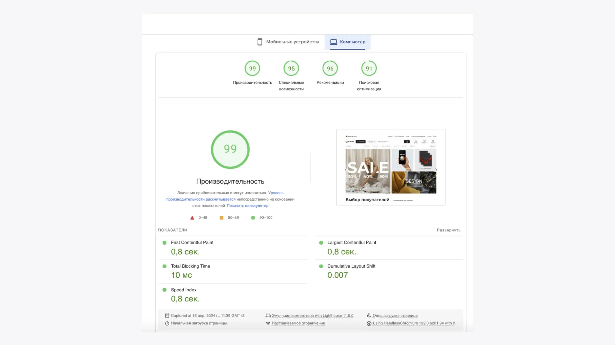 - Производительность по PageSpeed достигла 99 баллов.