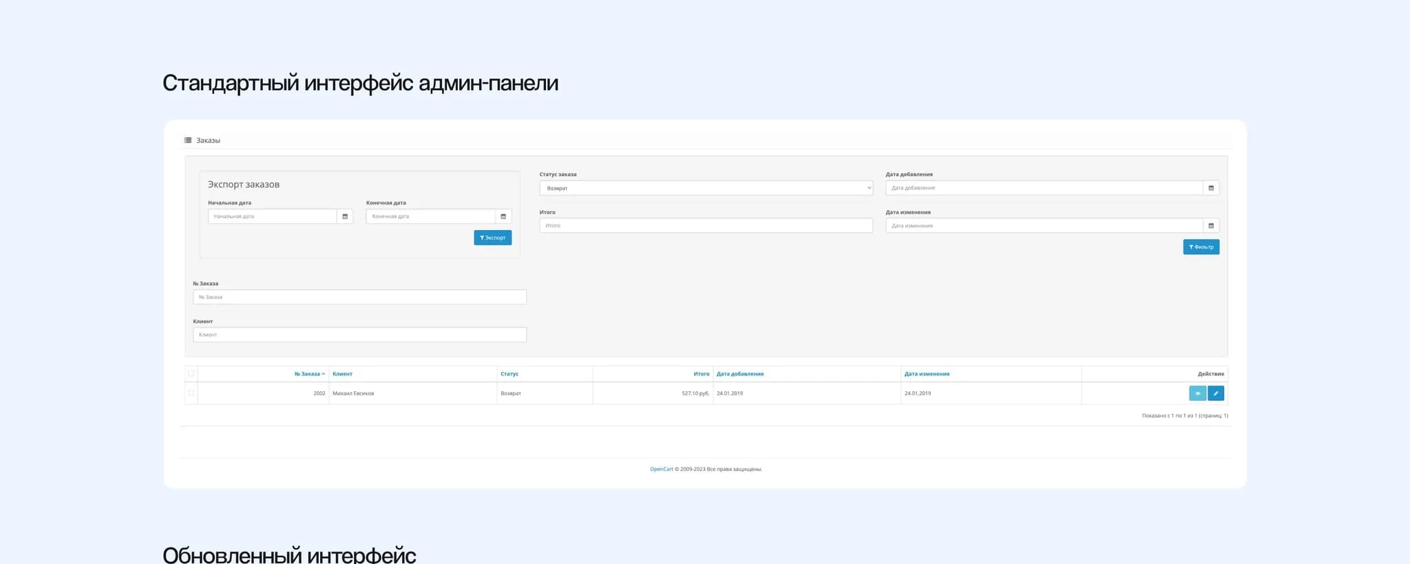 - Система учета. Ее как раз не было — клиент не вел базу 1С и CRM-систему тоже. Функции учета остатков на складе и контроля рабочих процессов нам предстояло добавить в админ-панель Opencart.
