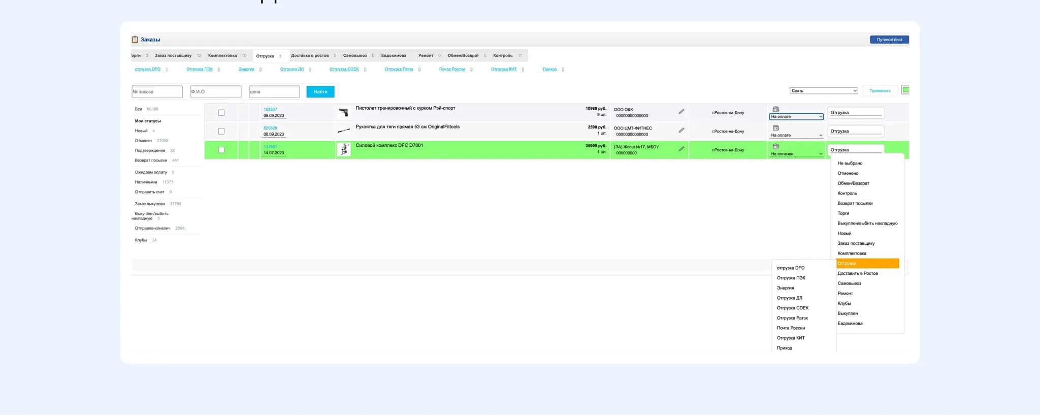 Сотрудники могут быстро обновить статусы заказов и отправить уведомление покупателю по почте. Клиенты отслеживают путь товаров от склада до пункта выдачи в удобном формате.